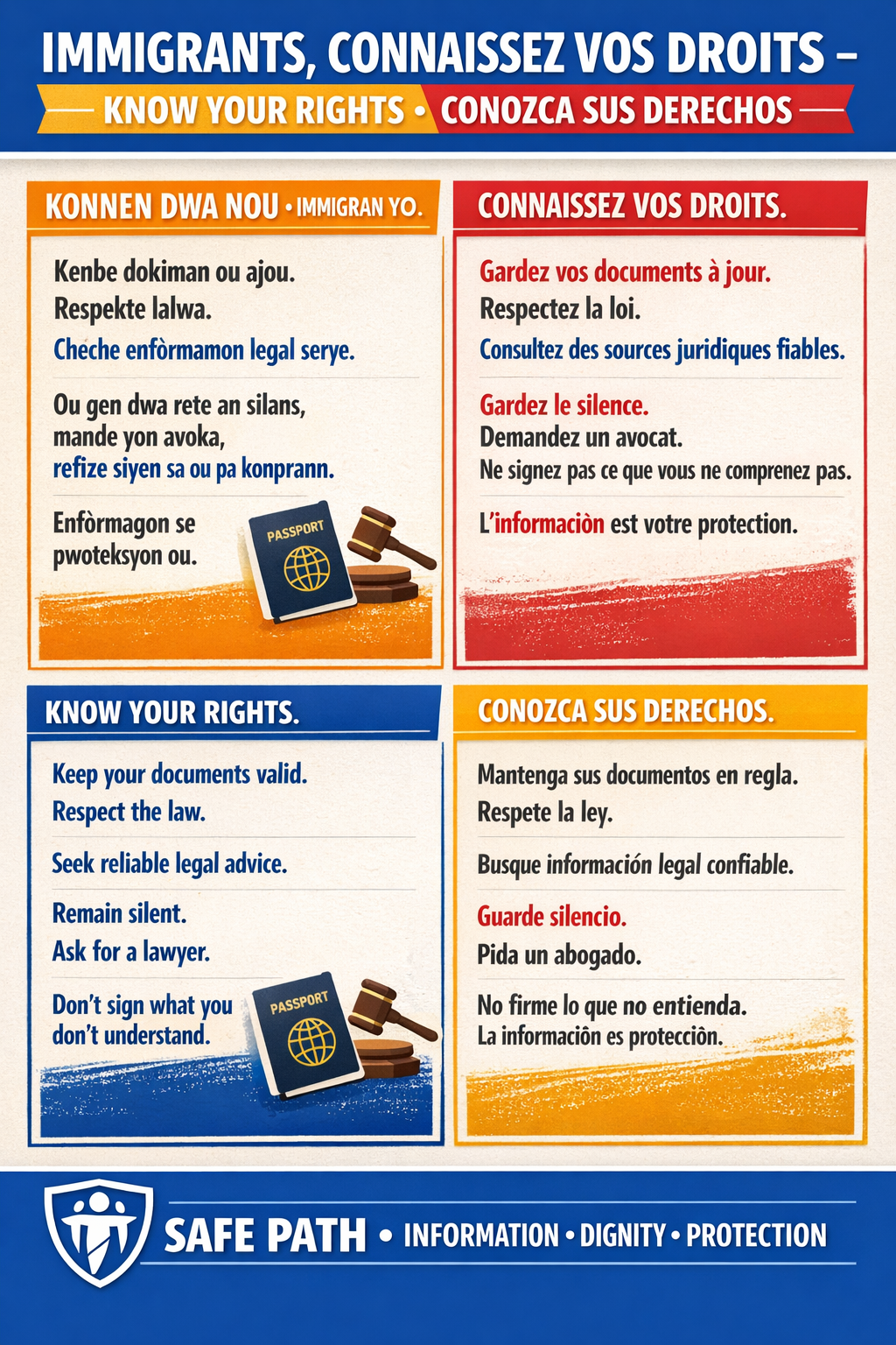 Li rekòmande tou pou imigran yo konnen dwa fondamantal yo: dwa pou rete an silans, dwa pou mande yon avoka, epi dwa pou pa siyen okenn dokiman yo pa konprann. Rete enfòme, rete kalm, epi chèche asistans legal se pi bon fason pou pwoteje tèt yo kont arestasyon oswa depòtasyon ki pa jis.